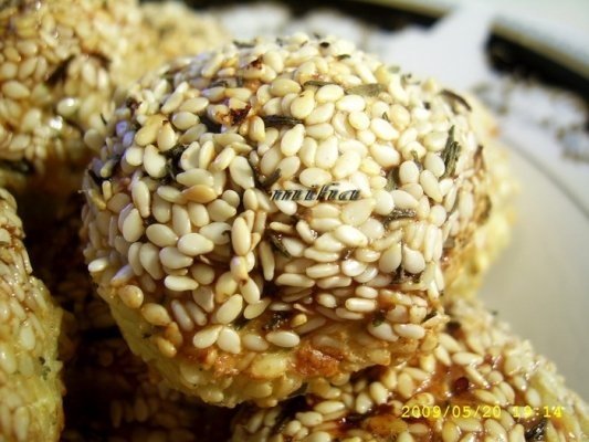 Intr-o farfurie pregatim amestecul aromatic din susan,cimbru si boia de ardei prin care vom tavali chiftelutele.