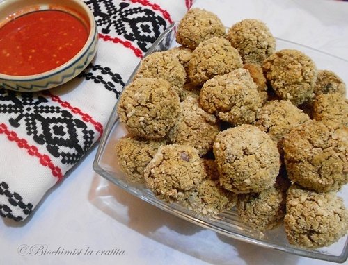 7. Din compozitie, formam bilute cu mainile umede, pe care le vom rostogoli prin pesmet, iar apoi le punem pe o tava tapetata cu hartie de copt. Introducem tava in cuptor timp de 40 min si cam asta-i tot... Verificati daca sunt coapte, eu am pus doua tavi deodata si s-au copt mai greu.