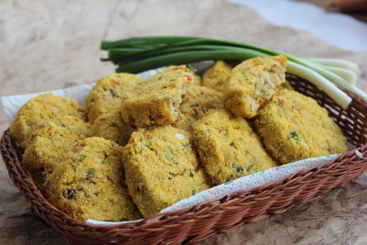 Pornim cuptorul. Pregatim o tava cu hartie de copt. Luam cu o lingura din compozitie si formam chiftele de marime medie, le dam prin malai si apoi le asezam in tava. Dupa ce le-am format pe toate, le stropim cu un pic de ulei de masline, presaram un praf de sare si le punem la copt,in cuptor, la foc mediu, pentru aproximativ 30 - 40 minute, pana se rumenesc frumos. Se scot din cuptor, se lasa sa se raceasca apoi se asaza cu multa atentie pe un platou pentru a fi servite. Sunt foarte, foarte fragede si gustoase.