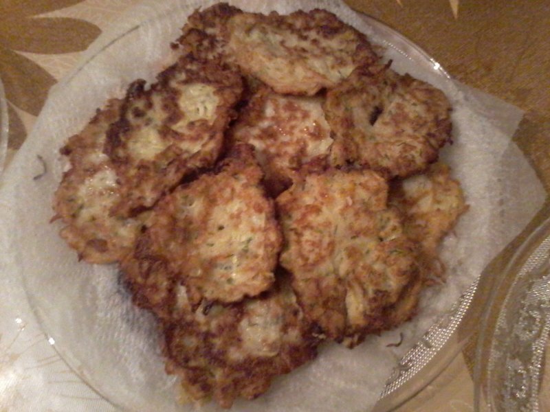 Se curata si se rad dovleceii pe razatoarea mare, se amesteca cu un praf de sare si se pun pt 15 min intr-o strecuratoare la stors deoarece vor lasa zeama. Dupa acest timp, se pun intr-un vas mai mare si se adauga toate ingredientele mentionate, pe rand.