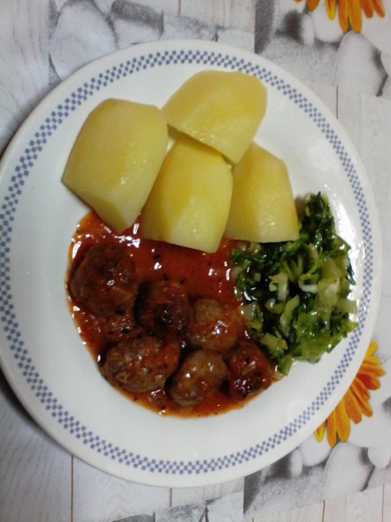 Pentru chiftele se amesteca uleiul, usturoiul pisat, ceapa tocata marunt, menta, patrunjelul, sarea si piperul. Apoi se adauga ouale, carnea, ouzo si pesmetul si se amesteca bine pentru omogenizare. Acoperim vasul cu membrana alimentara si lasam la frigider 2 ore. Se formeaza chifteluţe care se coc 15 minute la cuptor. Apoi, chiftelele se pun în sos si se lasa la fiert 30 de minute, miscand vasul din cind in cind.