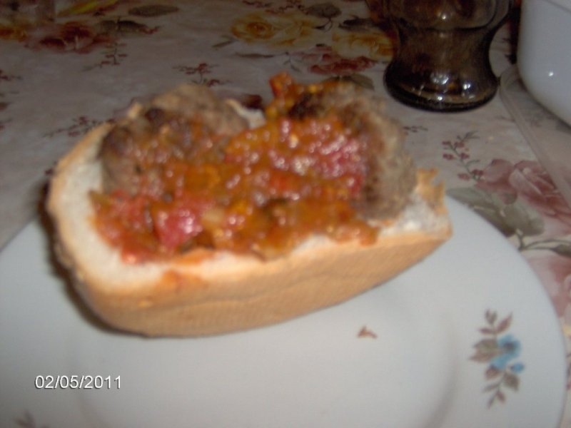 Se incalzeste cuptorul la 200 de grade.In franzela se face un capac in partea de sus si se scoate miezul aproape pina la coaja.Se da la cuptor citeva minute dupa care se pune pe un platou si se pun chiftelutele in piine si se toarna sosul deasupra.Se serveste asa in piine din care se taie la fiecare o portie.Chiftelutele in acest sos sint pe placul copiilor iar in piine ii atrage si mai mult.