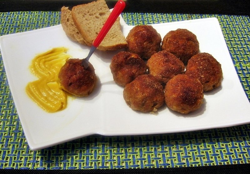 Formam bilute rotunde cat mingea de pimpong le trecem prin pesmet si le asezam in hartii de copt pentru briose, apoi le trecem in tava.