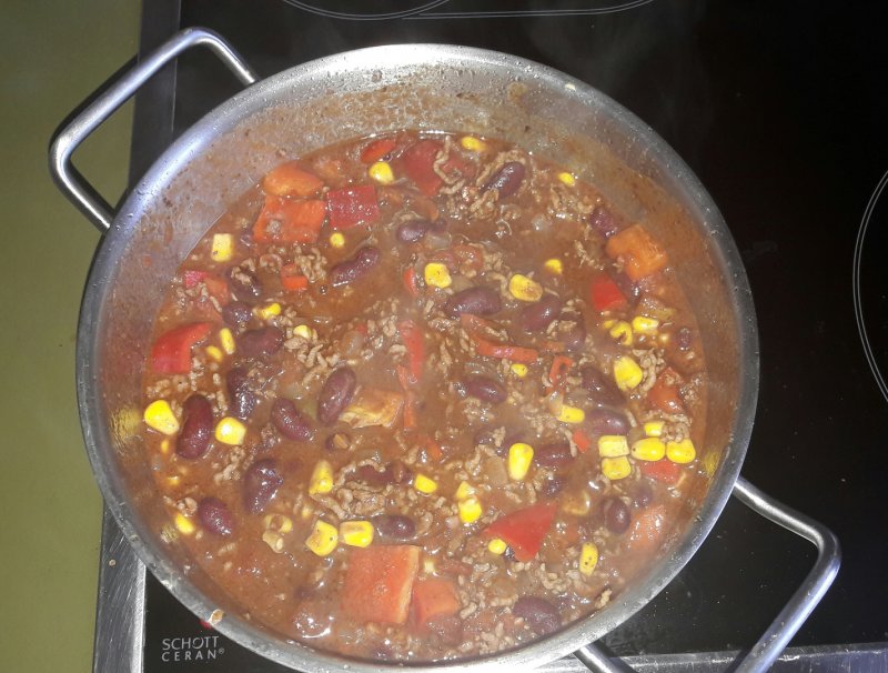 După asta, se adauga fasolea, porumbul si ardeiul gras tăiat în cuburi, se pune oregano, apoi ciocolata tăiată în bucaţi. Se lasă la fiert pe foc mic aprox. 10-12 min.