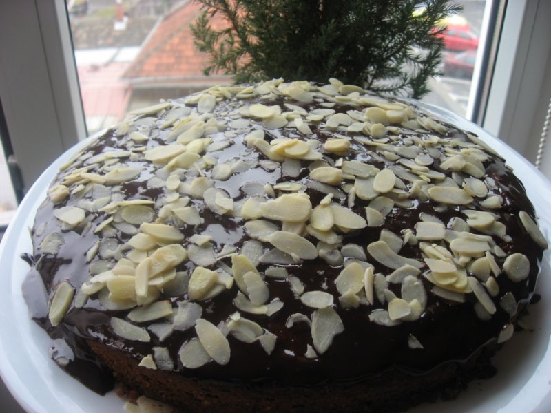 Pregatim glazura: Intr-un vas pe foc mic punem ciocolata, untul si cafeaua sau romul si topim. Turnam peste blat si intindem astfel incat sa fie acoperit tot. Eu am presarat deasupra fulgi de migdale.