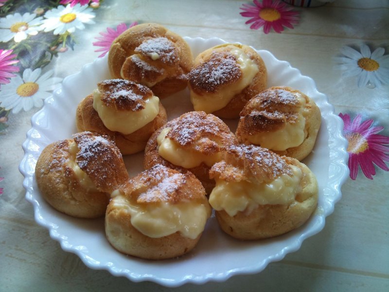 Bati ouale intregi si albusul pana obtii o spuma.Intr-o cratita mica, pune untul, laptele, apa, zaharul si sarea si lasa-le la fiert, la foc mediu, amestecand o data sau de doua ori in compozitie. Cand amestecul incepe sa fiarba ia cratita de pe foc si incorporeaza faina cu o lingura de lemn, pana obtii o compozitie omogena. Pune din nou cratita la foc mic, amestecand continuu,mai lasa pe foc aluatul circa 3 minute. Lasa aluatul un pic sa se raceasca ,apoi adauga incet ouale batute bine, amestecand bine compozitia pana se formeaza o pasta groasa, fina si lipicioasa. Da drumul la cuptor, pregateste o tava tapetata cu hartie de copt si pune aluatul in posul cu sprit. Cand incep sa se rumeneasca, sunt gata. Pentru umplutura poti pune crema de cremsnit dr. Oetker si frisca sau budinca de vanilie.