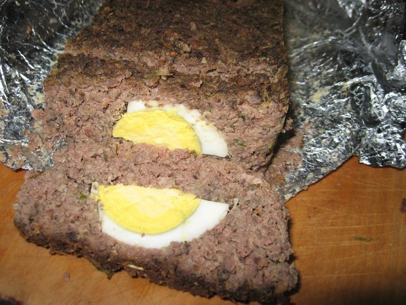 Se tapetează o tavă de chec cu hârtie de copt. Eu am rămas fără hârtie exact în prag de sărbători şi cum am uitat să cumpăr, am improvizat, folosind folie de aluminiu pe care am uns-o cu puţină margarină. Se pune din compoziţie în tavă pe jumătate. Peste aceasta se va aşeza câte o jumătate de ou fiert tare, după care se pune iarăşi un strat de compoziţie. Deasupra tăvii se va pune o folie de aluminiu, pentru 30 de minute.