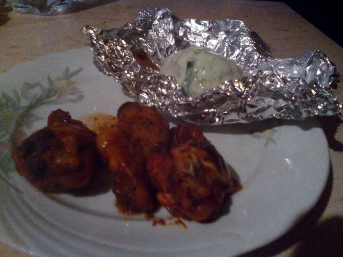 Se pune sare mare pe cartofi si se invelesc in folie. Se baga la cuptor si se lasa 45 minute la 200 grade dupa care se da la 170 grade si se pun si aripioarele.