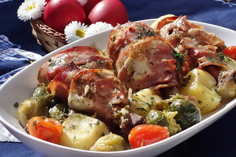 Ciocanelele spalate si curatate de piele (se indeparteaza) se cresteaza pe alocuri, se ung cu un pic de ulei, se ung cu mustar, apoi se sareaza si condimenteaza; Se infasoara fiecare in cate o felie de bacon, apoi se asaza unul langa altul in tavita, se adauga vinul si 100 ml apa si se dau la cuptor, cca. 40 minute. pana se intrepatrund si se rumenesc frumos.