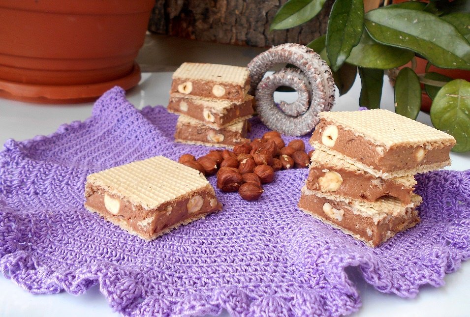 Pregatim doua foi de napolitana . Pe o folie punem o foaie, turnam ciocolata , nivelam si acoperim cu cealalta foaie . Apasam foaia , invelim in folie tot si punem la frigider cu un fund de lemn sau o tava umpluta peste ca sa nu se desprinda foaia de napolitana pusa deasupra.