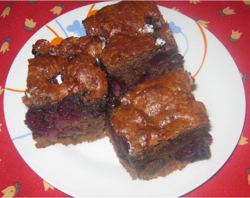 Adaugam si spuma de albus, amestecand cu grija. Punem compozitia intr-o tava tapetata cu hartie pergament. Deasupra, adaugam ciresele curatate de samburi si tavalite printr-un strat fin de faina. Dam la copt 30 de minuute, la 200 g Celsius.