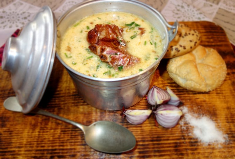 Frecam bine smantana cu galbenusurile de ou si un praf de piper si apoi adaugam peste bors.