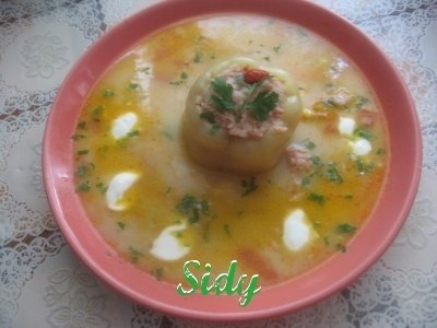 Cind fierbe ciorba adaugam ardeii umpluti si lasam sa fiarba. Daca mai este nevoie se mai pune apa ca sa depaseasca inaltimea ardeilor.