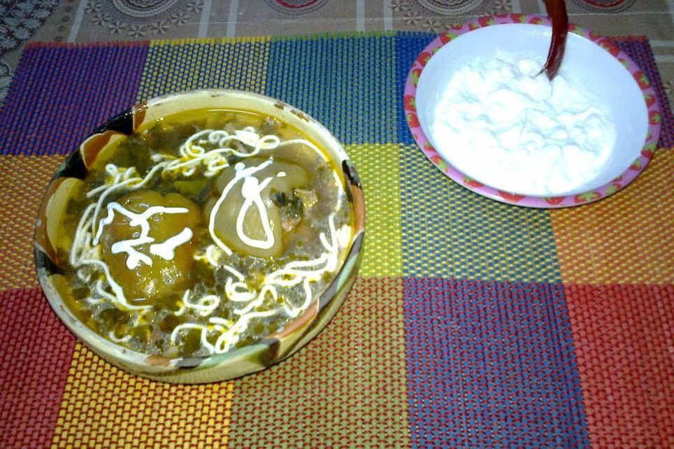 Spalam oasele de vita si le punem la fiert, avand grija sa spumuim des. Cat fierb oasele pregatim legumele si compozitia de carne tocata. Curatam si radem morcovii si telina, tocam marunt prazul si ceapa. Am avut ardeii cubulete, patrunjelul si ardeii pentru umplut congelati, asa ca doar i-am scos din congelator. :) Amestecam carnea tocata cu ceapa, orezul si patrunjelul. Asezonam cu sare si piper si umplem ardeii cu aceasta compozitie. Cand oasele sunt fierte le scoatem din ciorba si le lasam sa se racoreasca un pic, apoi scoatem carnea de pe ele. Punem din nou oala pe foc, adaugam morcovii, telina, prazul, carnea, ardeii umpluti si sare si lasam sa fiarba. Intre timp punem si borsul la fiert separat. Cand au fiert ardeii adaugam sucul de rosii si lasam sa mai dea cateva clocote, apoi punem frunzele de telina si borsul fiert. Dupa ce au dat un clocot adaugam leusteanul tocat si oprim focul. Servim cu smantana si ardei iute. Pofta buna!