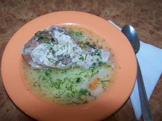 In compozitia de iaurt si galbenus, se pune 2-3 polonice de ciorba amestecand continuu pentru a nu se taia.