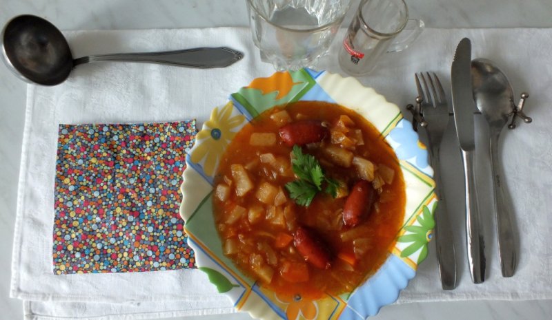 Se fierbe apa, se adauga peste zarzavaturi si se lasa la fiert, la foc potrivit, timp de 25 minute. Se potriveste de sare sau cu baza pentru mancaruri (delikat, vegeta, mirodenia), se adauga carnaciorii de bere si pasta de ardei iute si se mai lasa sa fiarba 10 minute.