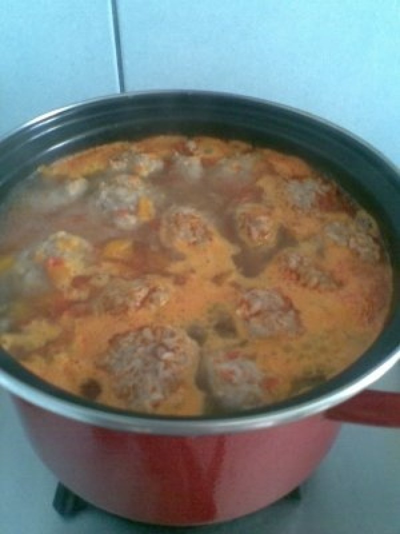 se pune la fiert o oala cu apa, se curata zarzavaturile si se taie cubulete. Cand fierbe apa se adauga zarzavaturile si intre timp se pregatesc perisoarele: se amesteca carnea tocata cu ouale batute, sare piper si orezul spalat. Se tine amestecul de perisoare cam 15 minute la frigider dupa care se modeleaza din el bilute mici care se adauga in apa cu zarzavatul fiert mai bine de jumatate. Se mai pot adauga si rosii decojite si taiate marunt (pentru o culoare mai frumoasa)sau ardei rosu taiat si calit in ulei(eu pun pe iarna gogosar cu ardei kapia la borcan si il folosesc la ciorbe). Se fierb perisoarele pana observati ca s-a umflat orezul si apoi dregeti ciorba cu smantana si adaugati verdeata tocata. Potriviti totul cu sare si piper dupa gust si pofta buna!