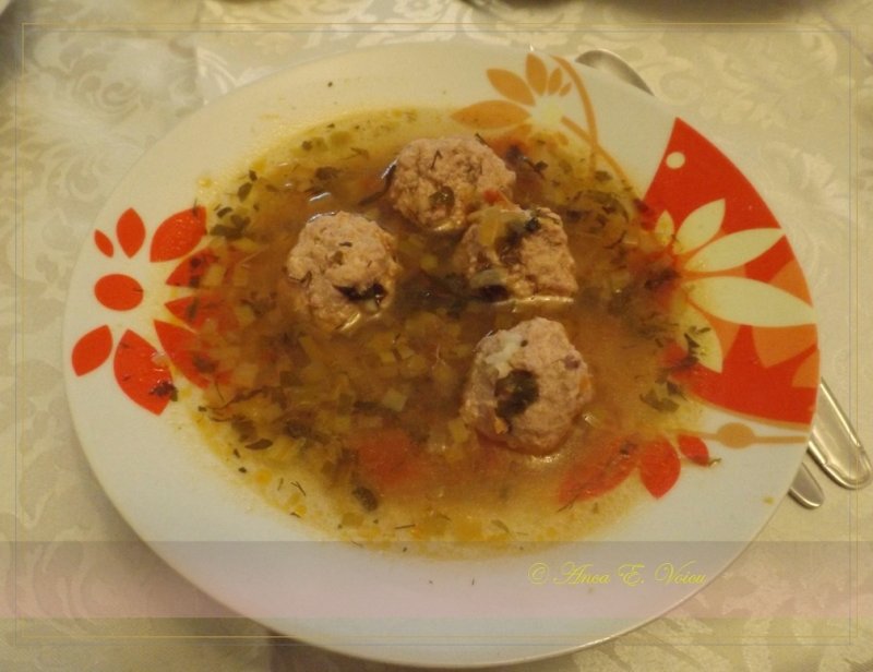 Cand este aproape gata, se prepara perisoarele. Se pune intr-un vas carnea tocata, o lingurita cu sare si un ou si se amesteca bine. Intr-un castronel punem apa, ca sa ne umezim tot timpul mainile si formam perisoarele.
