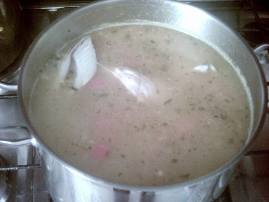 Luam legumele si le curatam de coji si seminte. Le spalam bine si le tocam in cubulete mai mici (sau mai mari, dupa cum ne place). Intr-o oala punem uleiul la incins, cind este bine incins punem toate legumele si le lasam sa se caleasca circa 5 minute, amestecind des pentru a nu se prinde de fund,dupa care adaugam vinul si orezul, amestecam bine si le mai lasam 1-2 minute. Dupa care adaugam 2,5-3 litri de apa, de preferinta fierbinte, acoperim cu un capac si lasam sa fiarba pina cind legumele sunt fierte. Cind legumele sunt fierte adaugam bucatile de peste curatate si spalate bine, leusteanul tocat marunt, potrivim de sare si acrim cu bors sau otet, in functie de preferinte sau de ceea ce avem in casa si ciorba e gata. Bucatile de peste nu se fierb mai mult de maxim 4-5 minute, pentru ca altfel se imprastie. Se serveste fierbinte si cu ardei iute. Pofta buna!