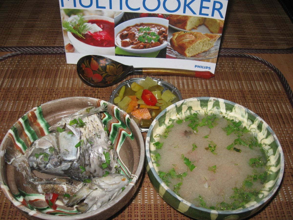 Punem în vasul de gătit 2 linguri ulei de măsline, 1,5 l apa şi selectam programul STEW 40 de minute. După 30 de minute zarzavatul este fiert şi atunci turnam borşul, punem sare şi condimente după gust şi închidem capacul. Dupa10 minute punem căpăţânile de peşte, apoi după 3-4 min. punem şi guvizii (întotdeauna se începe cu peştele mai mare, deoarece fierbe un pic mai greu). Când ciorba este gata se adauga oul bătut, usturoiul tocat mărunt şi verdeaţă tocată mărunt după gust.