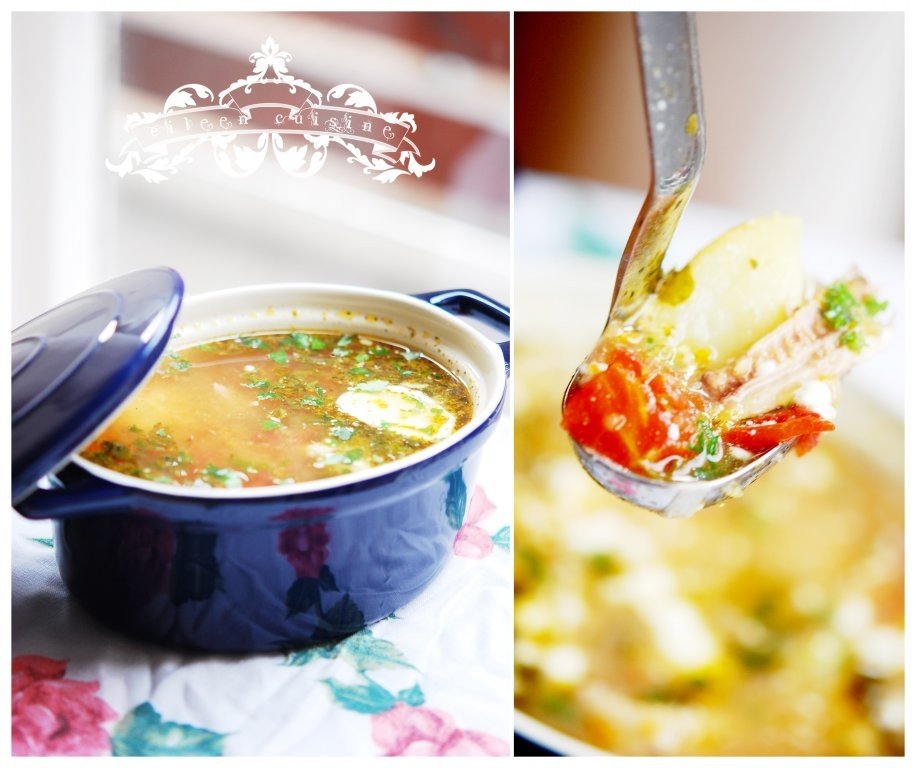 Se fierbe puiul timp de o ora la foc mic in 3,5 litri de apa rece. Se spumeaza. Cand nu mai face spuma, se adauga zarzavaturile si legumele care in prealabil au fost calite intr-o lingura de ulei pentru 5 minute. Se lasa la foc mic cu un capac acoperit 3 sferturi. Dupa 2 ore, sau cand legumele sunt aproape fierte, se adauga cartofii. Cand sunt aproape fierti se pune conserva de rosii si dupa 5 minute se pune delikat dupa gust, zeama de varza puneti in functie de cat de acra va place. Daca nu aveti, puneti bors sau praf de bors. Se pune piper si se ia de pe foc. Se adauga leustean si patrunjel tocat marunt. Se serveste cu ardei iute si smantana, dupa plac.