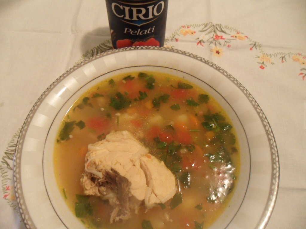 Dupa ce s-a fiert carnea pe jumatate, se adauga, legumele de ciorba (morcov , ceapa, pastarnac, mazare, fasole verde). Adaugam si o lingura de delikat. Lasam inca 10-15 min si adaugam rosiile din cutie, bine strivite, apoi cartofii taiati cuburi si taiteii. Lasam sa mai dea in clocot 10 minute, apoi adaugam borsul si mai fierbem 5 min. Stingem focul si adaugam leustean tocat.