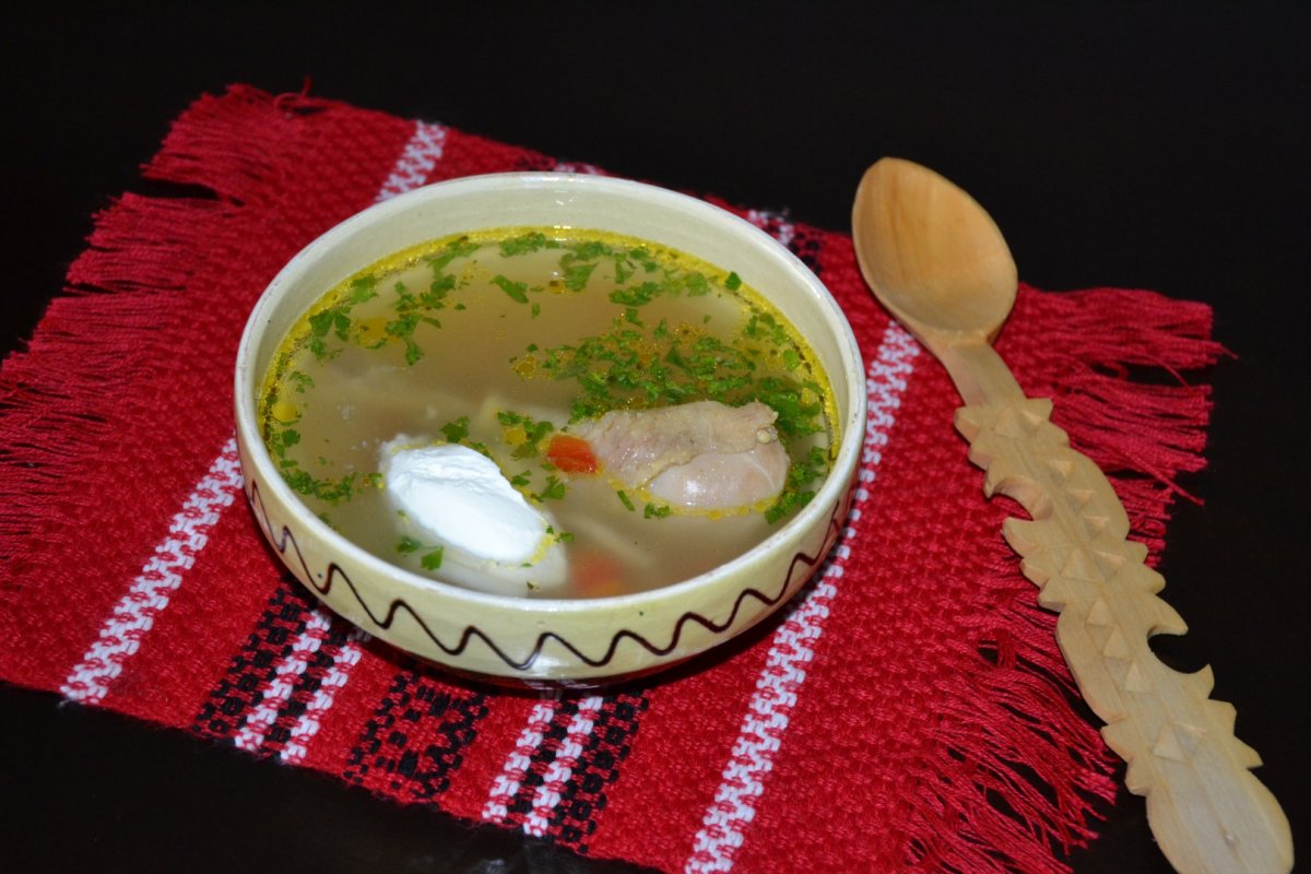 Pui intr-o oala apa rece, in jur de 2 litri si apoi pui bucatile de carne de pui. Lasi sa fiarba la foc mediu si aduni spuma formata. Eu am transferat apoi in oala sub presiune si am fiert carnea timp de 40 de minute, deoarece fiind pui de tara, ar fi durat prea mult timp sa fiarba normal. Transferi intr-o alta oala, mai mare, strecori supa si adaugi carnea, precum si morcovul, ardeiul si ceapa taiate marunt. Telina, pastarnacul si patrunjelul radacina le pun intregi si la final, le scot, dar daca doriti le puteti taia cubulete si sa le lasati in ciorba. Mai completati cu apa, dati focul mic si lasati pana cand acestea sunt fierte. Adaugati taiteii, lasati 5-8 minute, apoi puneti borsul si sare dupa gust si mai lasati sa clocoteasca pentru cateva minute. Inchideti focul si puneti verdeata proaspat tocata.