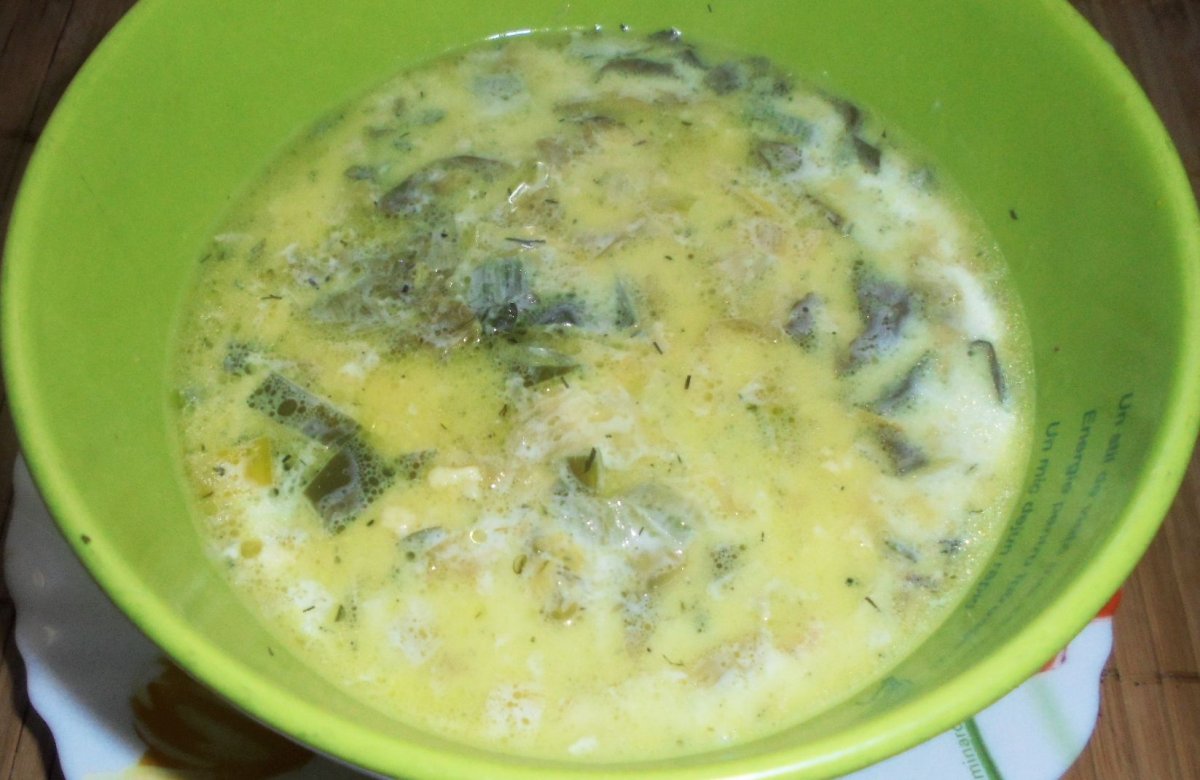 În vasul în care preparăm ciorba, punem uleiul şi untul, apoi adăugăm prazul şi usturoiul verde, toate tăiate mărunt, şi mestecăm din când în când până se înmoaie şi devin puţin lucioase - astfel vor căpăta o aromă mai puternică. Adăugăm 1 litru de apă caldă peste ele, sarea, mărarul, leuşteanul tocat şi le lăsăm să fiarbă aproximativ 15 minute. Adăugăm apoi salata verde tăiată mai grosier şi laptele, apoi le lăsăm să fiarbă încă 15 minute sub capac.