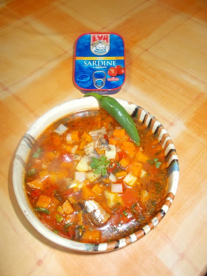 Desfacem conserva de peste si portionam sardinele pe care le adaugam la ciorba, impreuna cu bulionul pus dupa gust.