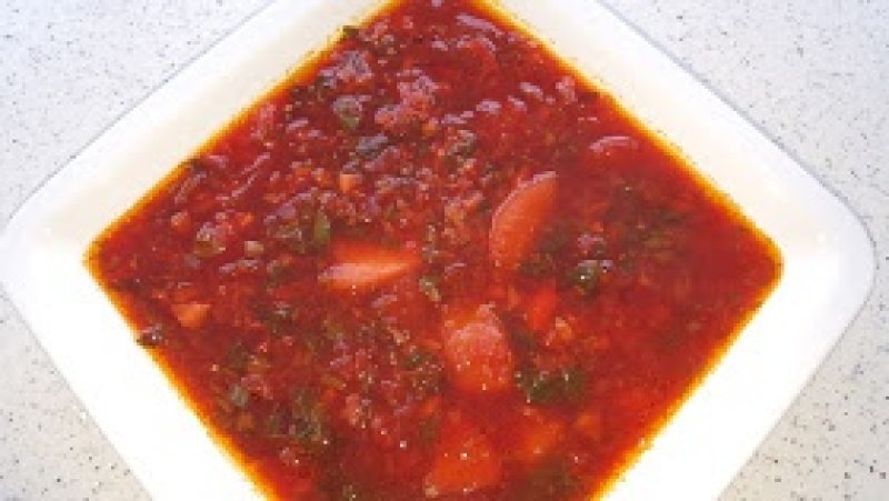Legumele se toaca marunt iar sfecla coapta se curata si se da prin razatoarea mare. Calim ceapa si usturoiul apoi capia cu morcovul apoi urmeaza orezul si sfecla cu radacinoasele. Punem vreo 3 l de apa fiarta si putina verdeata. Cand au fiert legumele punem rosiile si mai lasam cateva clocote. Potrivim de sare, punem restul de verdeata si incgidem focul. Este buna atat rece cat si calda, puteti servi si cu smantana sau iaurt. Sfecla coapta este mult mai gustoasa decat cea fiarta.