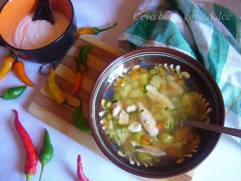 Se curata, se spala legumele si se taie. Se caleste ceapa taiata apoi se adauga zarzavatul taiat se caleste impreuna cu ceapa. Se adauga in oala la pui, pe urma se adauga cartofii taiati cuburi, mazarea si fasolea si bulionul. Se potriveste de sare, piper si zeama de lamai.