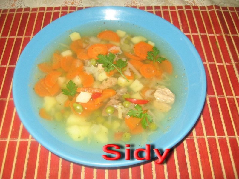 Peste carne se pune apa apoi legumele taiate marunt , frunzele de leustean, sare si piper.
