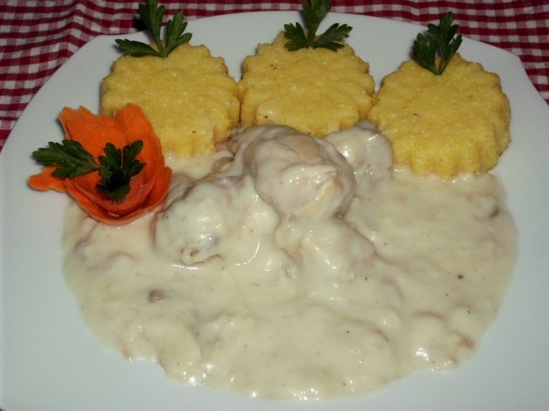 Spalam puiul si il portionam sau, daca avem carne de pui, o spalam bine. Punem carnea la fiert in apa rece. Cand incepe sa fiarba adunam spuma care se formeaza de cate ori este nevoie. Adaugam apoi legumele taiate mai mari si lasam sa fiarba. Cand s-a fiert carnea se scoate si se da deoparte. Legumele se pot folosi la salate sau alte preparate. Separat punem untul la topit, adaugam apoi faina si amestecam bine sa nu se arda. Subtiem cu lapte si amestecam cu un tel sa nu se formeze cocoloase,apoi adaugam si smantana. Punem in sos ciupercile si carnea de pui. Mai lasam sa dea cateva clocote. Potrivim gustul de sare si piper. Servim ciulamaua calda cu mamaliguta.