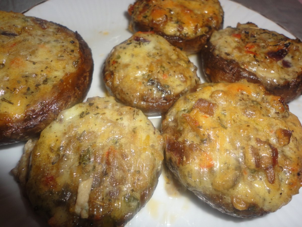 Se lasa pana se inmoaie legumele cand sunt moi legumele se piseaza usturoiul si se mai lasa sa fiarba pana scade bine apa, maxim 5 min. Dupa ce s-au inmuiat, se umple palaria ciupercii cu ajutorul unei lingurite si se preseaza bine. Procedati la fel cu toate ciupercile, dupa care puneti-le in tava tapetata cu hartie de copt. Se lasa pana ce se rumenesc frumos, cam 15 minute la foc mic, apoi scoateti tava si se adaugati telemeaua blenduita si amestecata cu un oul si busuiocul. Se mai lasa 5 minute la cuptor.
