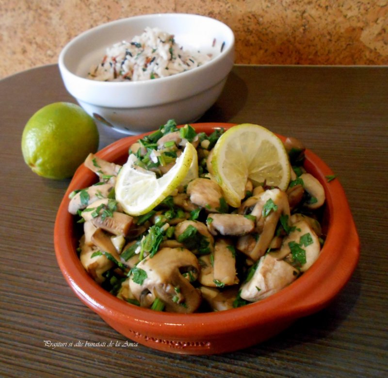 Punem pe foc un wok, sau o tigaie antiaderenta si o lasam sa se incinga bine . Punem ciupercile .Peste ele stoarcem zeama de la o jumate de limeta si amestecam din cand in cand . Eu nu folosesc ,de obicei, ulei pentru ca ciupercutele lasa zeama si se gatesc in sucul lor.