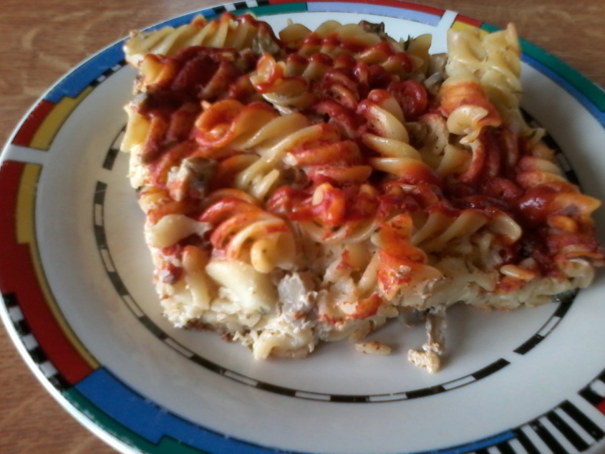 Dupa ce ciupercile s-au facut le punem in strecuratoare si pe ele fiindca vor mai lasa apa. Le lasam la scurs dupa le punem peste macaroane. Amestecam si adaugam ouale si smantana.