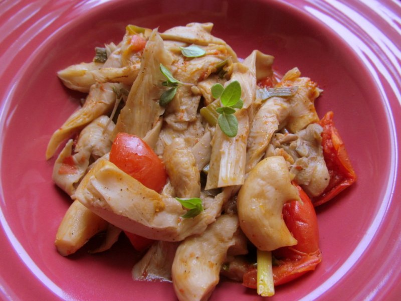 Stropim o tigaie cu ulei de măsline și călim puțin usturoiul și roșiile tăiate în 4. Tăiem ciupercile felii și le adăugăm în tigaie.
