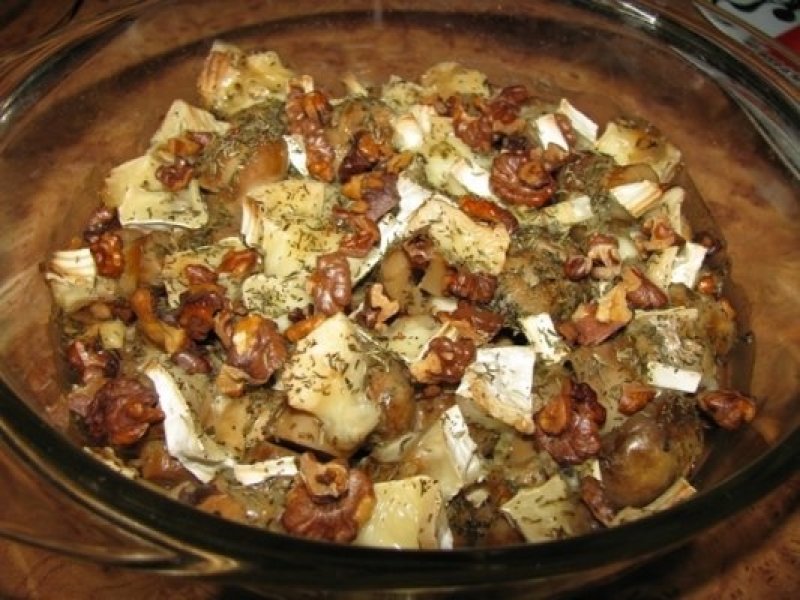 1. Incalzeste cuptorul la 200ᵒC.Pune ciupercile intr-un vas termorezistent.Presara deasupra branza, nucile tocate, thym si bucatele de unt.