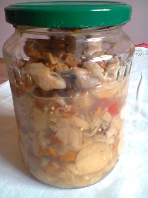 Ciupercile se spala si oparesc 30 minute.Se scurg bine si se taie feliute. Se aseaza ciupercile in borcan.Printre feliile de ciuperci se aseaza feliute de catei de usturoi si cubulete de gogosar.Restul de ingrediente se fierb si se toarna peste ciupeci.Pentru un borcan de 400 ml am pus: