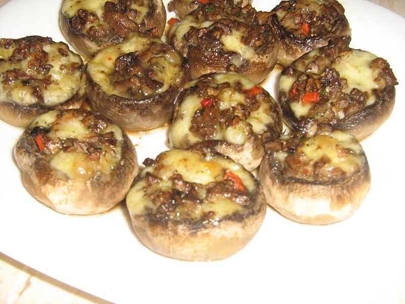 Se umple fiecare ciuperca cu amestecul de mai sus. Se adauga printre ciuperci usturoiul taiat feliute subtiri.