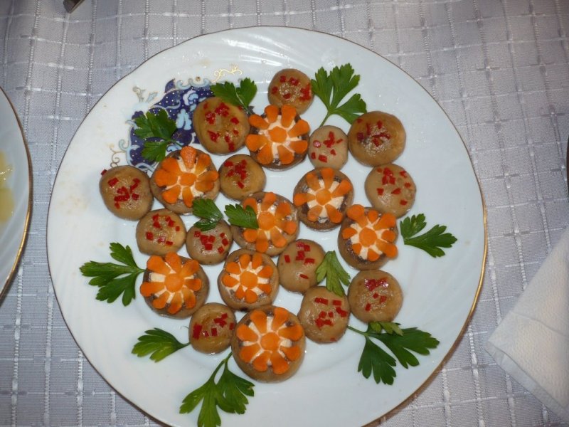 5.Pe margine se orneaza cu frunze de patrunjel verde si ciuperci intoarse cu ardei rosu peste.