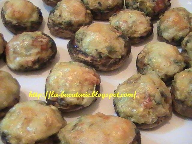 Ciupercile se spala bine si li se rup coditele pe care le taiem cubulete marunte. Peste capacele de ciuperci presaram putina sare si le lasam separat pana cand le vom umple. Ceapa taiata maruntel se pune la prajit in 2 linguri de ulei incins. Cand capata culoare aurie, punem si cateii de usturoi taiati si ei maruntel si lasam 2 minute sa se amestece aromele. Apoi punem peste ceapa, coditele de la ciuperci si lasam sa se inmoaie bine. Cand sunt si acestea patrunse punem putin cascaval, cubuletele de salam/sunca si patrunjelul tocat. Le lasam la foc cam 3 minute si le scoatem intr-un castron la racit. Dupa ce s-au racit, adaugam branza feta, untul topit, iarasi putin cascaval si condimentam dupa plac. Ciupercile le clatim cu apa rece ca sa se duca surplusul de sare, le uscam usor pe prosoape de hartie si incepem sa le umplem. Intr-o tava pentru cuptor, intindem hartie de copt si asezam ciupercile umplute. Presaram pe fiecare cascaval ras si dam la cuptor pana se rumenesc.