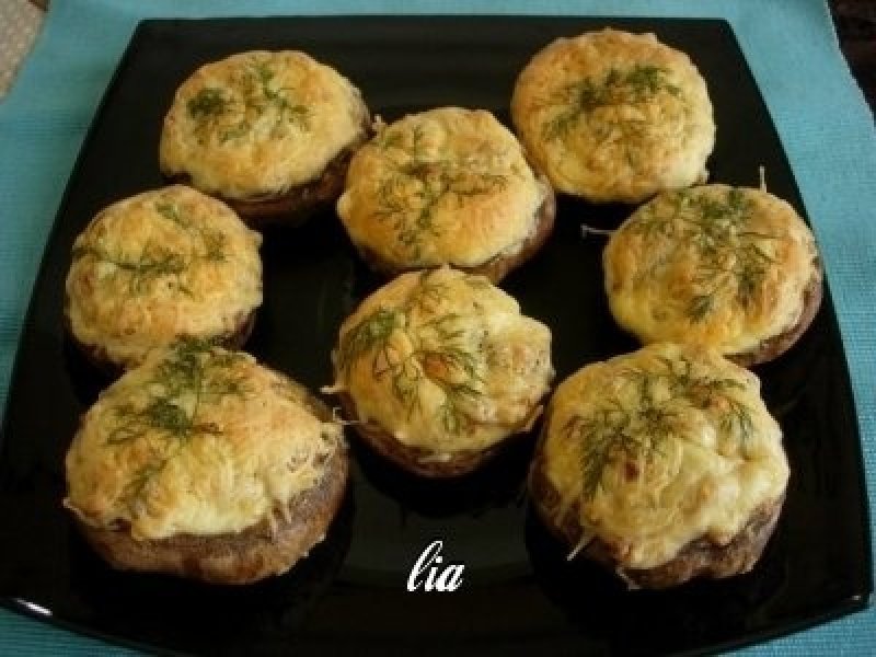 Trecem ciupercile pe sub un jet de apa, pentru a indeparta excesul de sare, punem in fiecare ciupercuta cate putina branza topita, apoi umplem cu compozitia de mai sus. Acoperim fiecare ciuperca, cu cascaval ras, in pic de smantana si o frunzulita de marar.