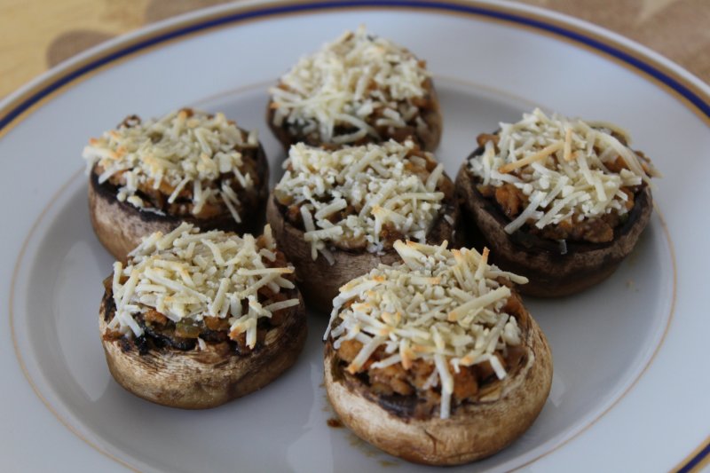 Separat intr-un vas facem umplutura: amestecam soia cu coditele, ceapa, boiaua, verdeata tocata, piper si vegeta si praful de usturoi. Amestecam si umplem ciupercile.