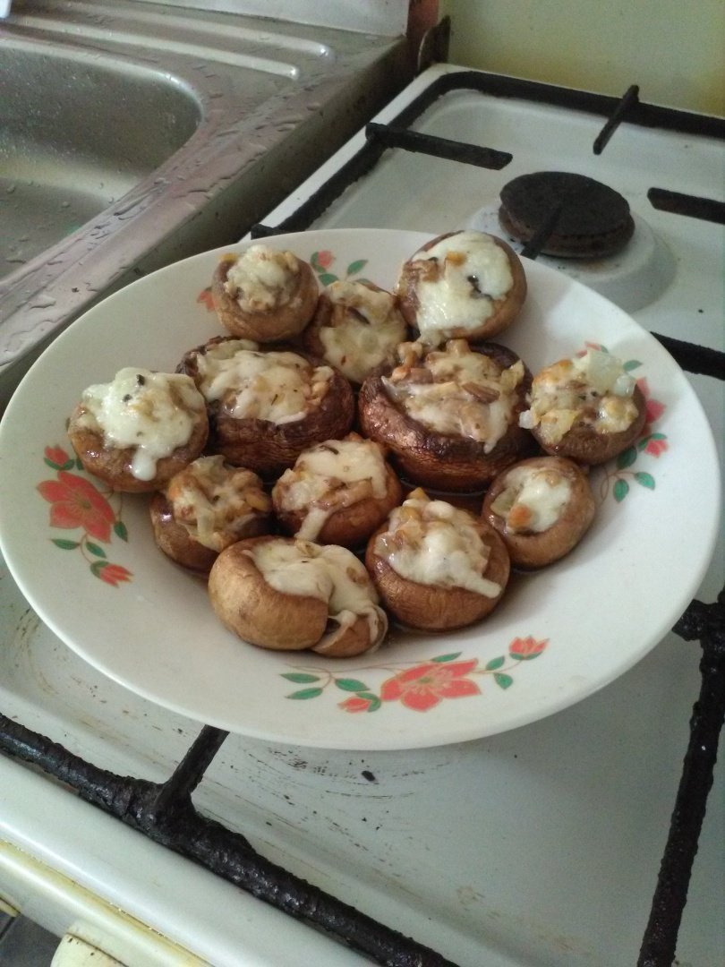 Dupa ce am luat de pe foc ceapa cu ciupercile calite, se amesteca cu cascavalul ras si se umplu ciupercile, dupa care se dau 10 minute la cuptor.