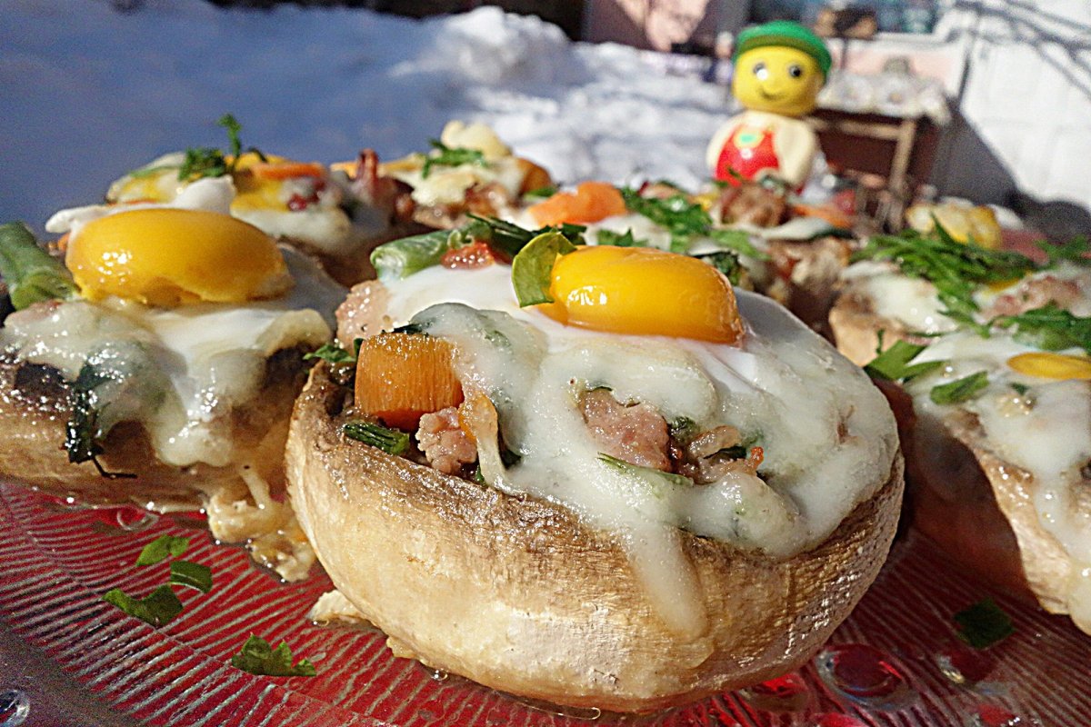Se indeparteaza cu grija piciorusele la ciuperci, apoi le curatatam de pielita si le asezam cu scobitura in sus, in tava in care am pus hartie pentru copt. Se sareaza si se stropesc cu un pic de ulei de masline fiecare scobitura a ciupercilor, apoi se dau 15-20 minute la cuptor. Intre timp, pregatim umplutura, calind in ulei de masline, ceapa tocata fin, impreuna cu ciolanul afumat taiat marunt si cu amestecul de legume. Cand se inmoaie bine totul, adaugam carnea tocata, sarea, amestecul de condimente si lingura de legume deshidratate, lasam sa fiarba in voie, pana ce scade sucul lasat si incepe sa se rumeneasca totul frumos. Oprim focul si adaugam verdeata tocata fin.