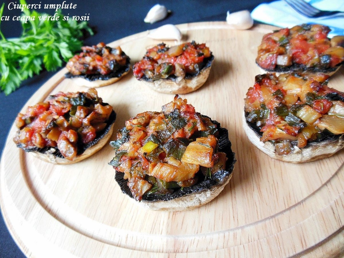 Foile de ceapa verde le spalam, le taiem rondele, iar coditele de ciuperci le tocam.