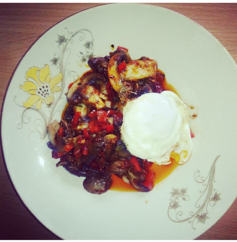 Intre timp pregătim uleiul pentru oua și când sunt gata, le punem printre ciuperci.