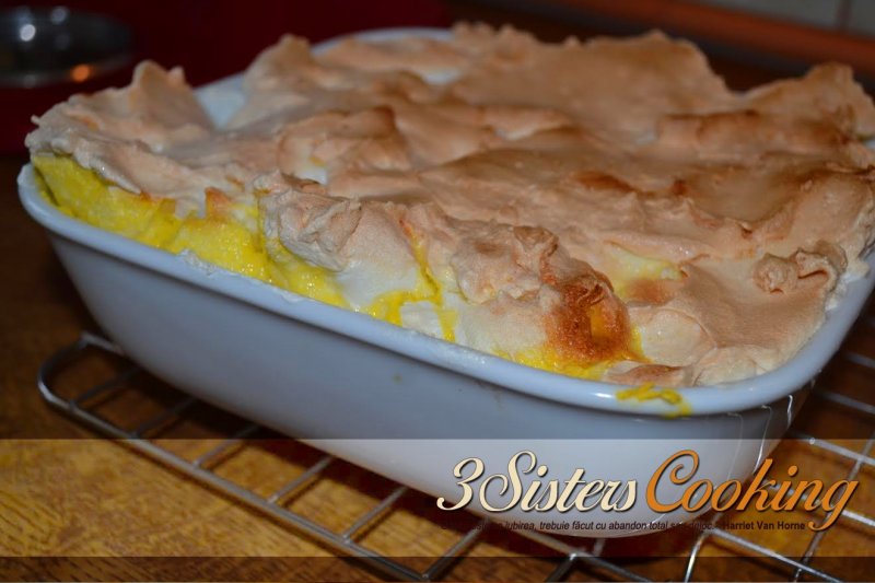 3. Intre timp se monteaza albusurile cu restul de zahar(120 g), pana devin tari. O data ce sosul de vanilie incepe sa se intareasca, puneti deasupra bezeaua intr-un strat generos si dati din nou la cuptor pana se rumeneste frumos deasupra. Se servesc imediat..