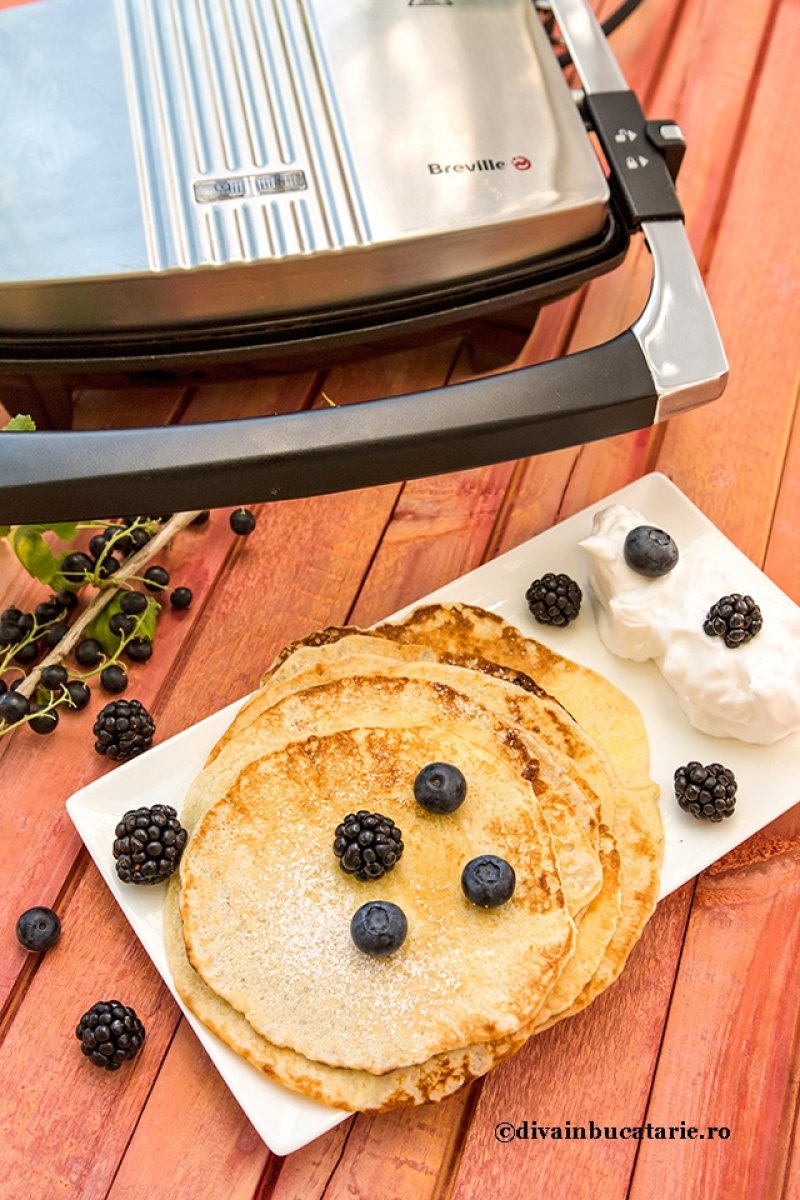 Conectam aparatul Panini Maker Breville la o sursa de curent. Ungem cu o pensula cu ulei ambele plite, punem o lingura din compozitie, punem capacul si coacem clatitele pana se rumenesc usor (40-60 secunde). Scoatem fiecare clatita cu o spatula si o lasam sa raceasca. Dupa ce terminam toata compozitia de aluat pudram cu zahar. Cand mancam clatitele punem un topping din frisca si fructe de padure.